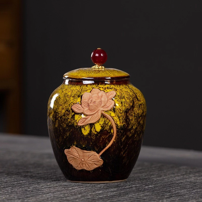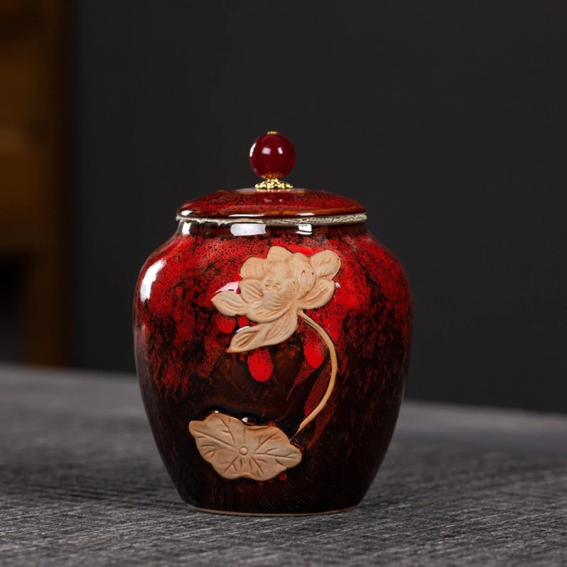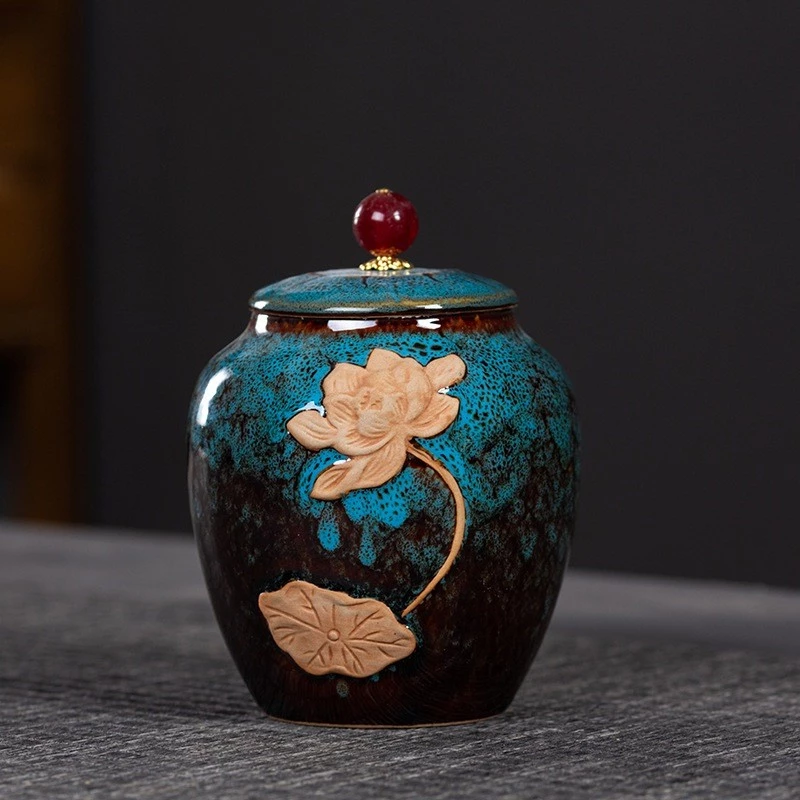 Hũ, Bình đựng trà bằng sứ họa tiết hoa sen